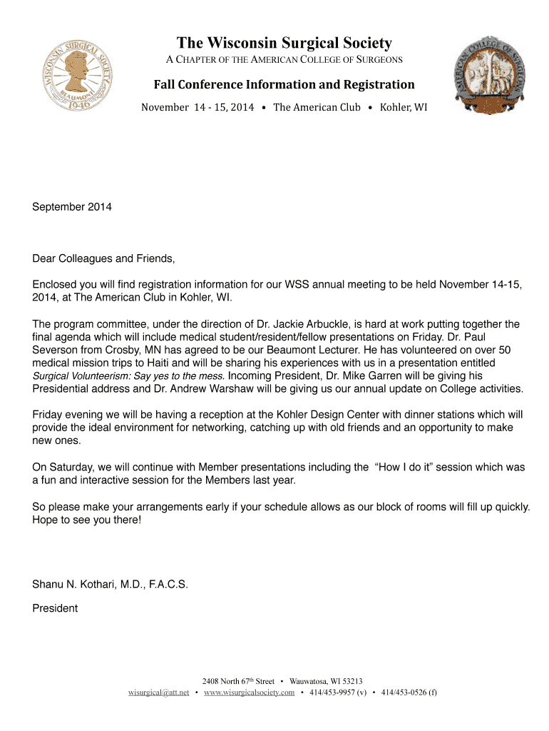 The Wisconsin Surgical Society A CHAPTER OF THE AMERICAN COLLEGE OF SURGEONS Fall Conference Information and Registration November 14 15, 2014 The American Club Kohler, WI September 2014 Dear Colleagues