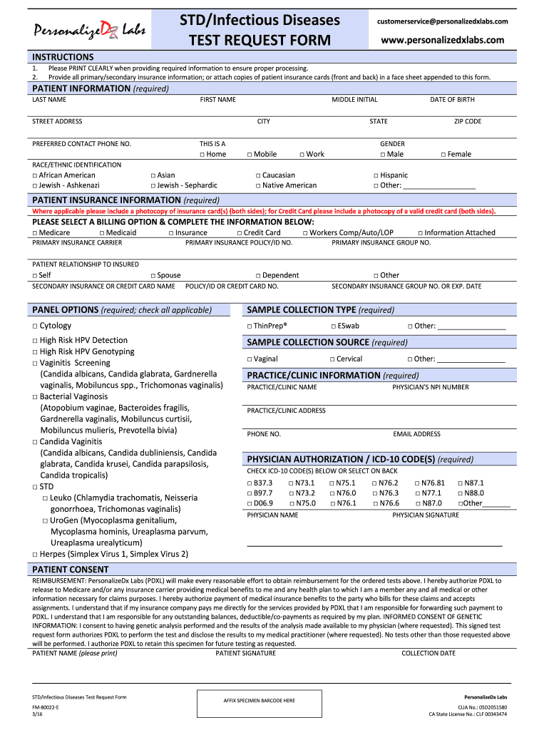 STD/Infectious Diseases TEST REQUEST FORM customer service personalizedxlabs.com www.personalizedxlabs.com INSTRUCTIONS 1. 2. Please PRINT CLEARLY when providing required information to ensure proper