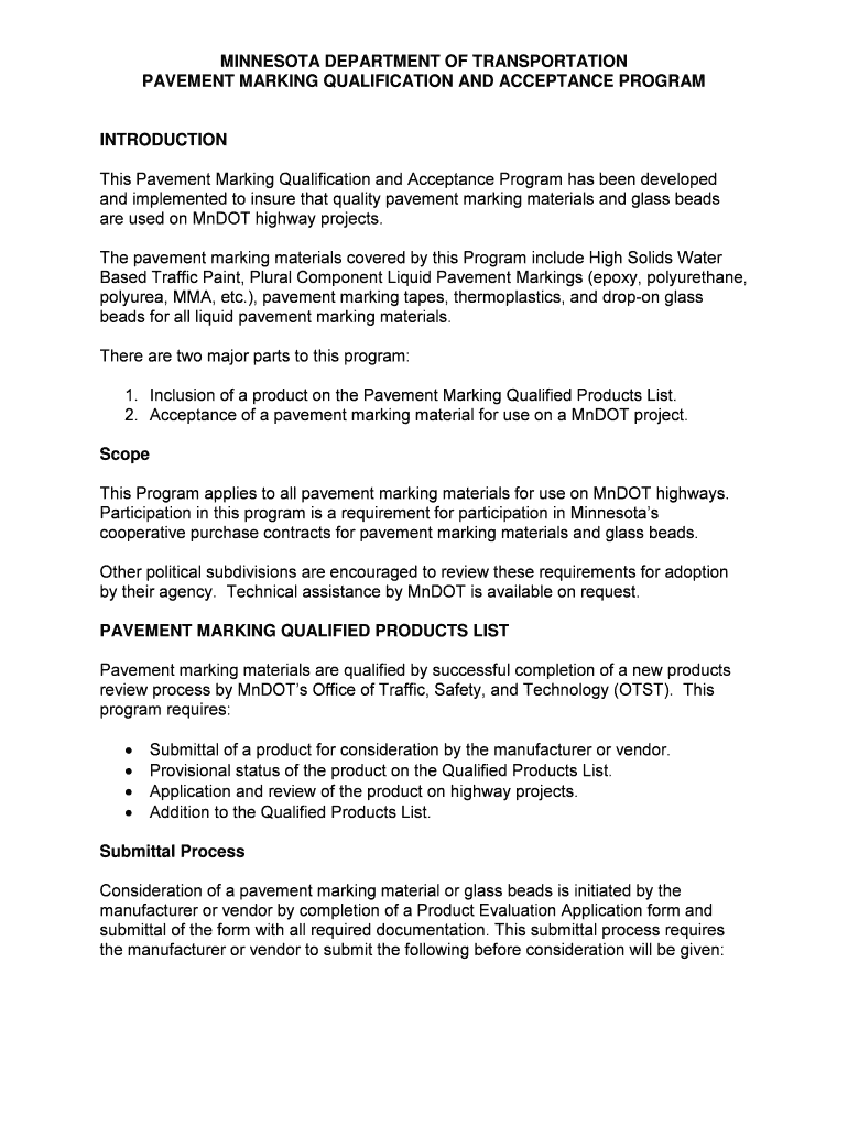 This Pavement Marking Qualification and Acceptance Program has been developed
