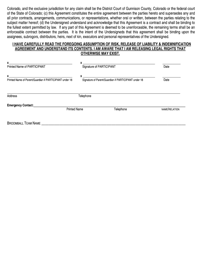 Broomball releasedoc can be filled out by providing participant information, emergency contacts, and signatures acknowledging the risks involved.