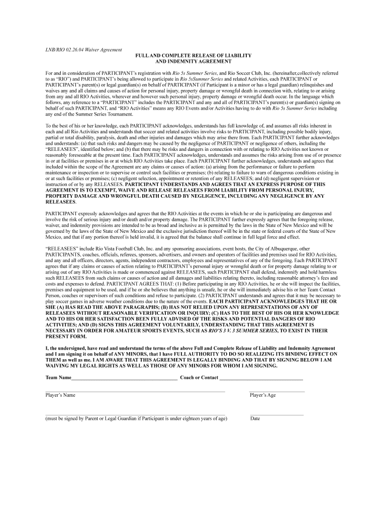 Get the free Rio 5s Website - Individual waiver form - Rio Rapids Soccer Club - riorapids