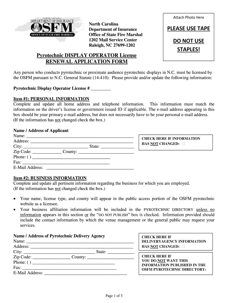Attach Photo Here North Carolina Department of Insurance Office of State Fire Marshal 1202 Mail Service Center Raleigh, NC 276991202 PLEASE USE TAPE DO NOT USE STAPLES! Pyrotechnic DISPLAY OPERATOR
