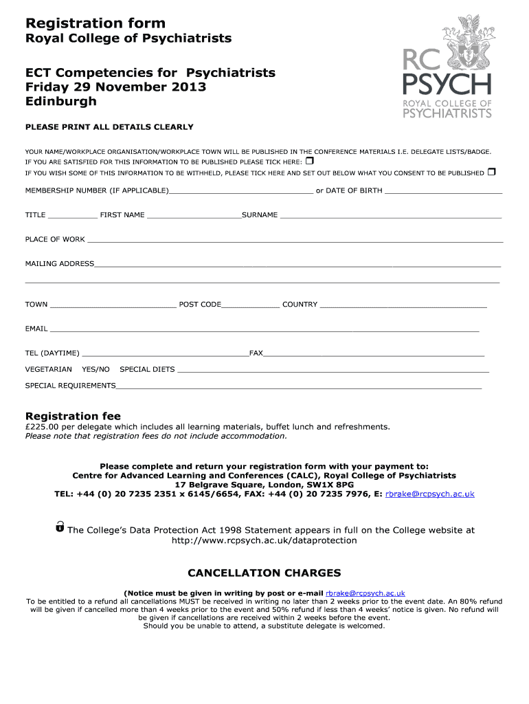 Registration form Royal College of Psychiatrists ECT Competencies for Psychiatrists Friday 29 November 2013 Edinburgh PLEASE PRINT ALL DETAILS CLEARLY YOUR NAME/WORKPLACE Organization/WORKPLACE TOWN