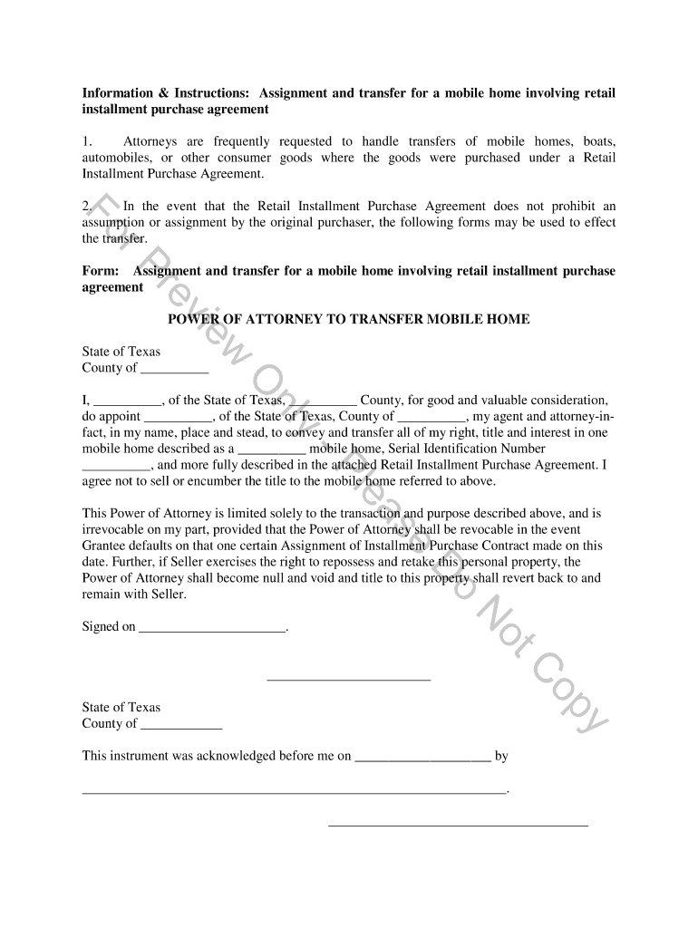 Information & Instructions: Assignment and transfer for a mobile home involving retail installment purchase agreement 1. Attorneys are frequently requested to handle transfers of mobile homes, boats,