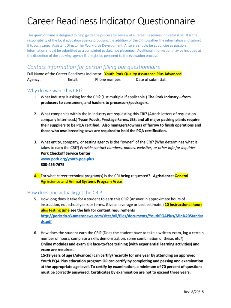 This questionnaire is designed to help guide the process for review of a Career Readiness Indicator (CRY). It is the