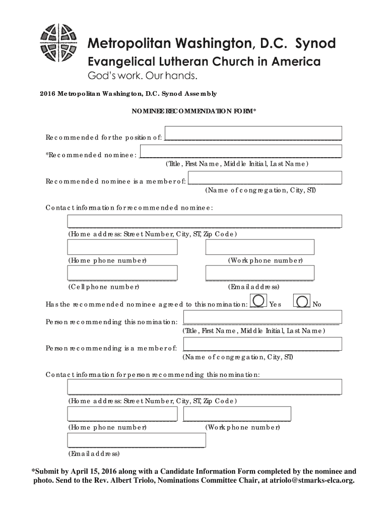 2016 Metropolitan Washington, D.C. Synod Assembly. ... *Submit by April 15, 2016, along with a Candidate Information Form completed by the nominee and photo.