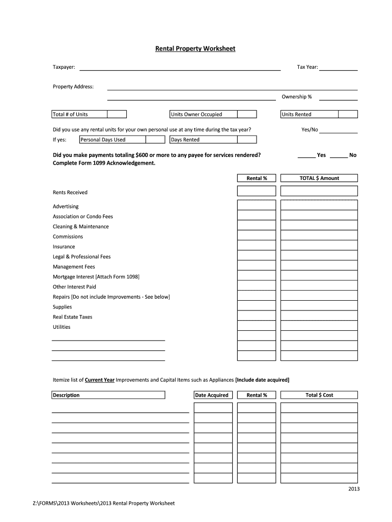 Rental Property Worksheet Taxpayer: Tax Year: Property Address: Ownership % Total # of Units Owner Occupied Units Rented Did you use any rental units for your ...