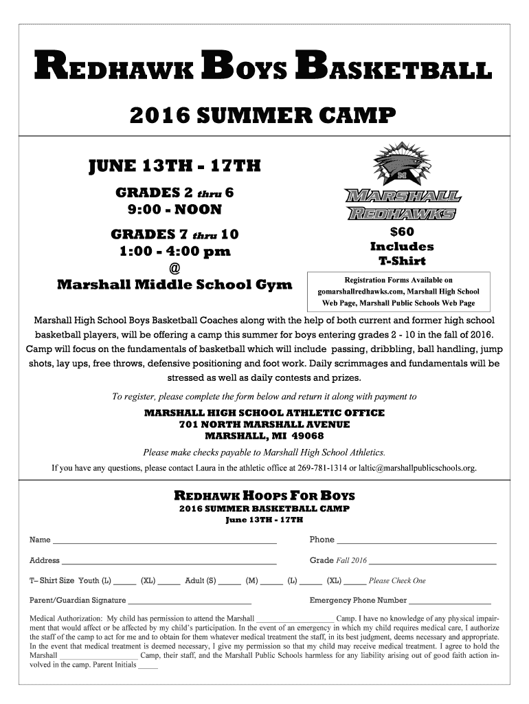 REDRAWN BOYS BASKETBALL 2016 SUMMER CAMP JUNE 13TH 17TH GRADES 2 through 6 9:00 NOON GRADES 7 through 10 1:00 4:00 pm Marshall Middle School Gym $60 Includes Shirt Registration Forms Available on