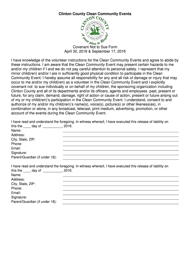 Clinton County Clean Community Events Covenant Not to Sue Form April 30, 2016 & September 17, 2016, I have knowledge of the volunteer instructions for the Clean ...