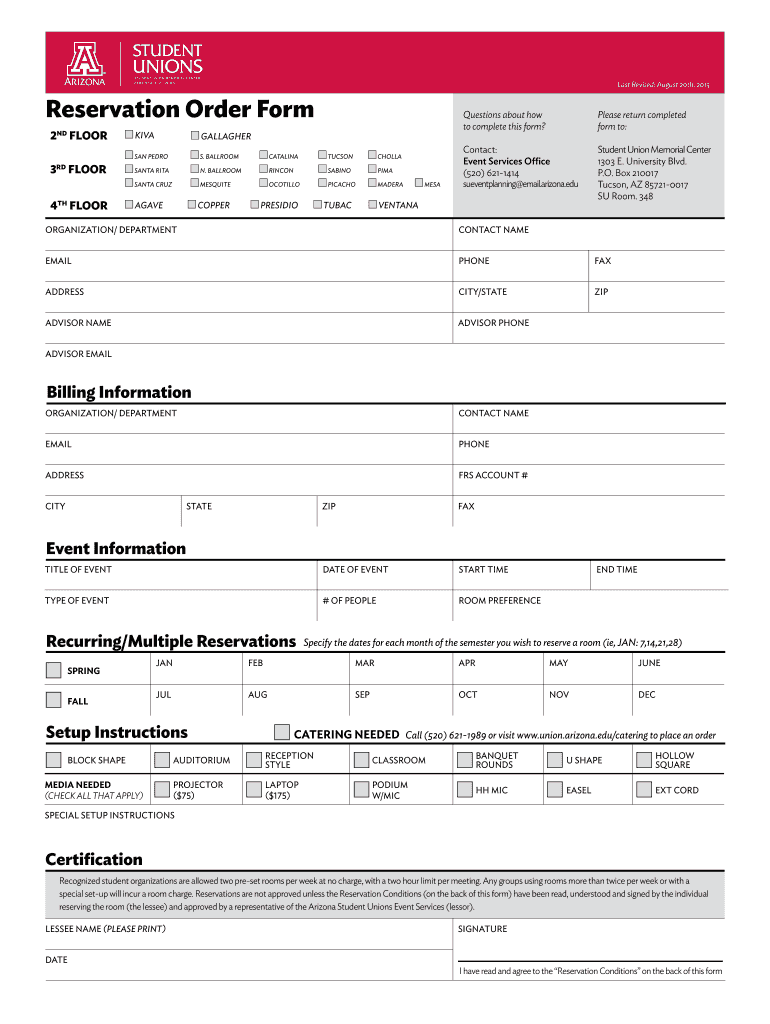 Reservation Order Form 4th Floor Agave copper Presidio tuba Montana ... 2013 please return completed form to: Student non-Memorial Center 130 E university Blvd