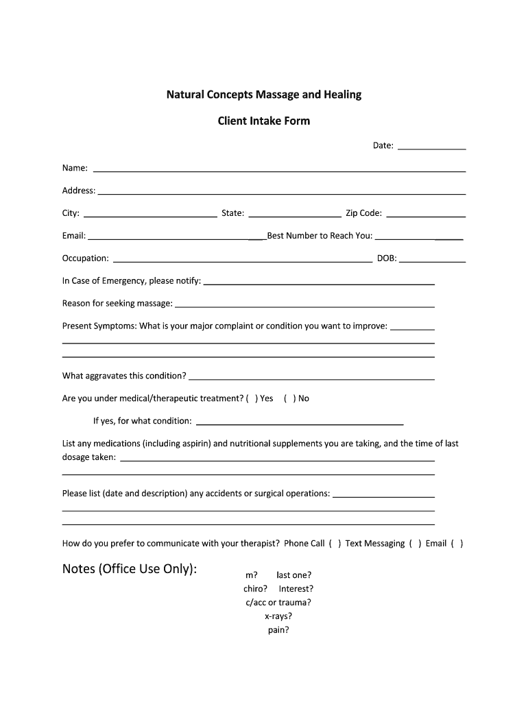 Natural Concepts Massage and Healing Client Intake Form Date: Name: Address: City: State: Email: Zip Code: Best Number to Reach You: Occupation: DOB: In Case of Emergency, please notify: Reason for