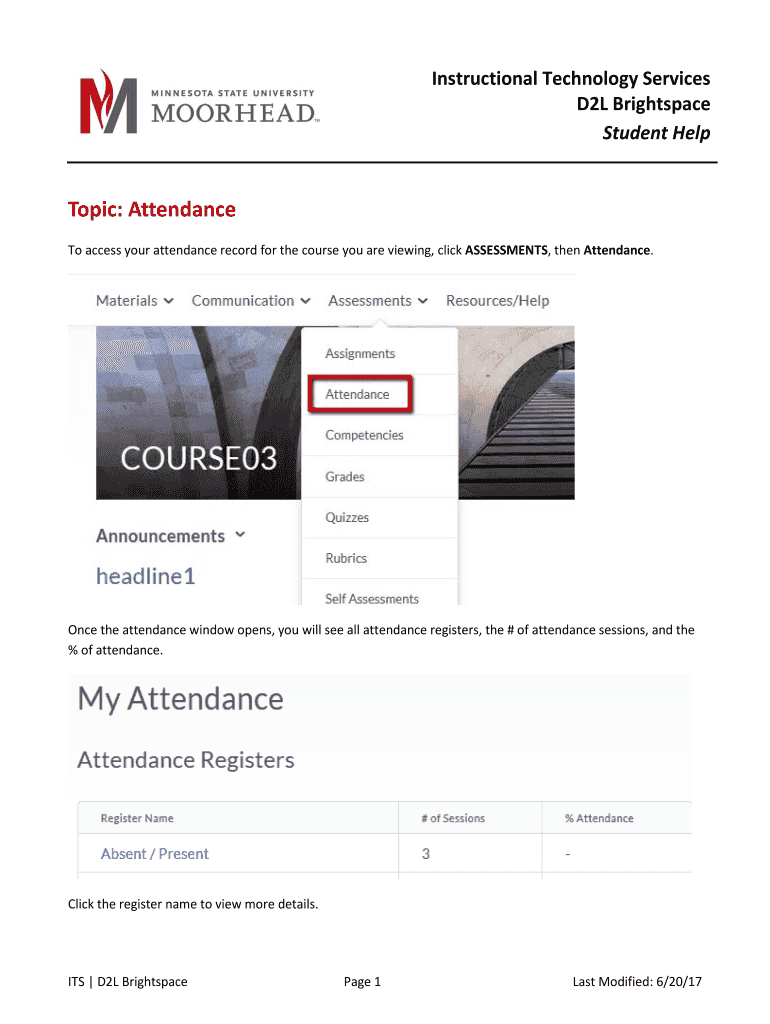 Instructional Technology Services D2L Bright space Student Ectopic: Attendance To access your attendance record for the course you are viewing, click ASSESSMENTS, then Attendance. Once the attendance