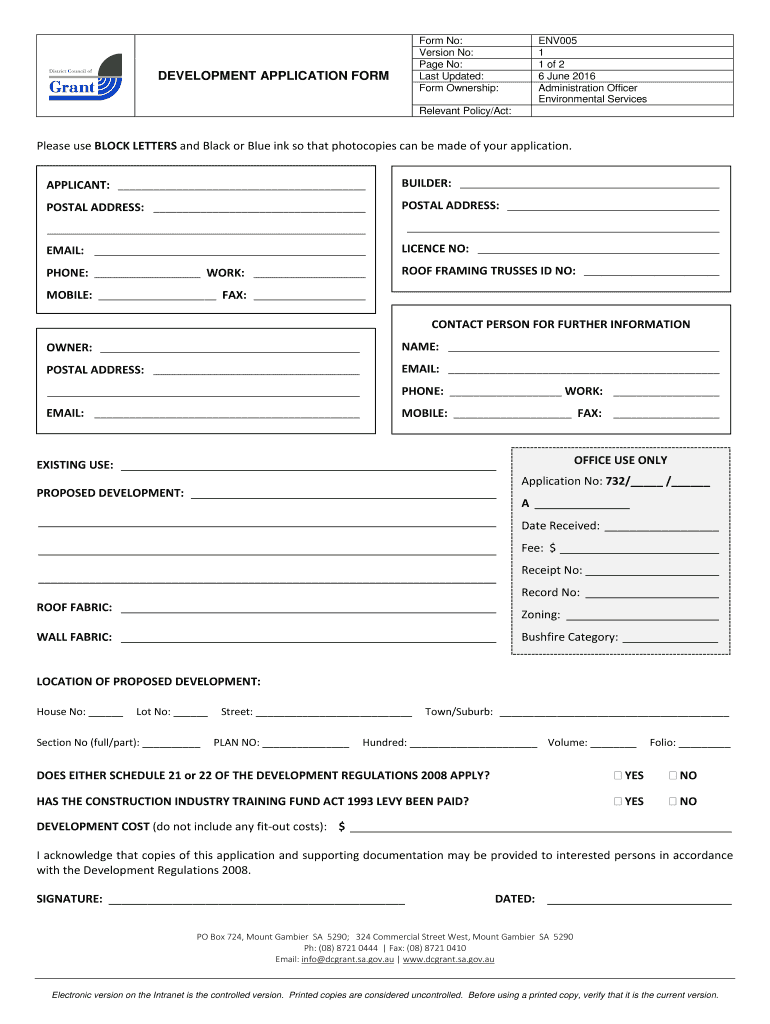 Form No: Version No: Page No: Last Updated: Form Ownership: DEVELOPMENT APPLICATION FORM ENV005 1 1 of 2 6 June 2016 Administration Officer Environmental Services Relevant Policy/Act: Please use BLOCK