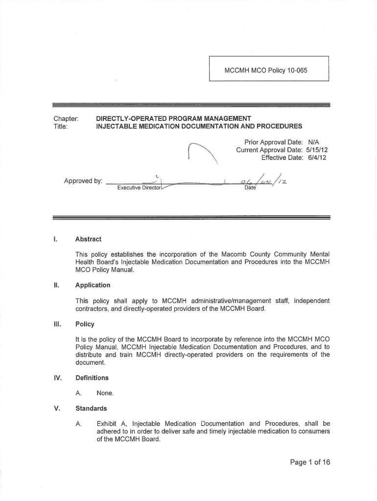 MUCH MCO Policy 10-065 INJECTABLE MEDICATION DOCUMENTATION AND PROCEDURES Date: 5/15/12 VI. Procedures A. VII. References / Legal Authority A. VIII. Procedures are contained in attached Exhibit A.