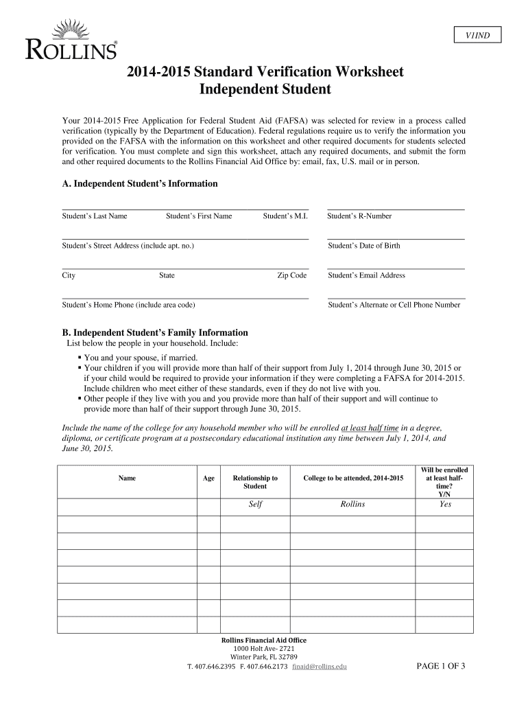 The 2014-2015 Verification Worksheet is designed for independent students who are enrolled at Rollins College and need to provide additional information for financial aid verification.