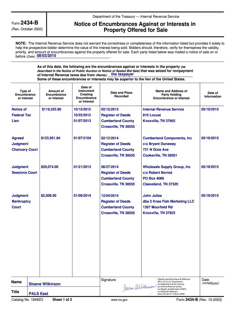 08/03/2015 the taxpayer ... Revenue Code states that a certificate of sale of personal property ... period, the Area Director shall, upon receipt of the certificate of.