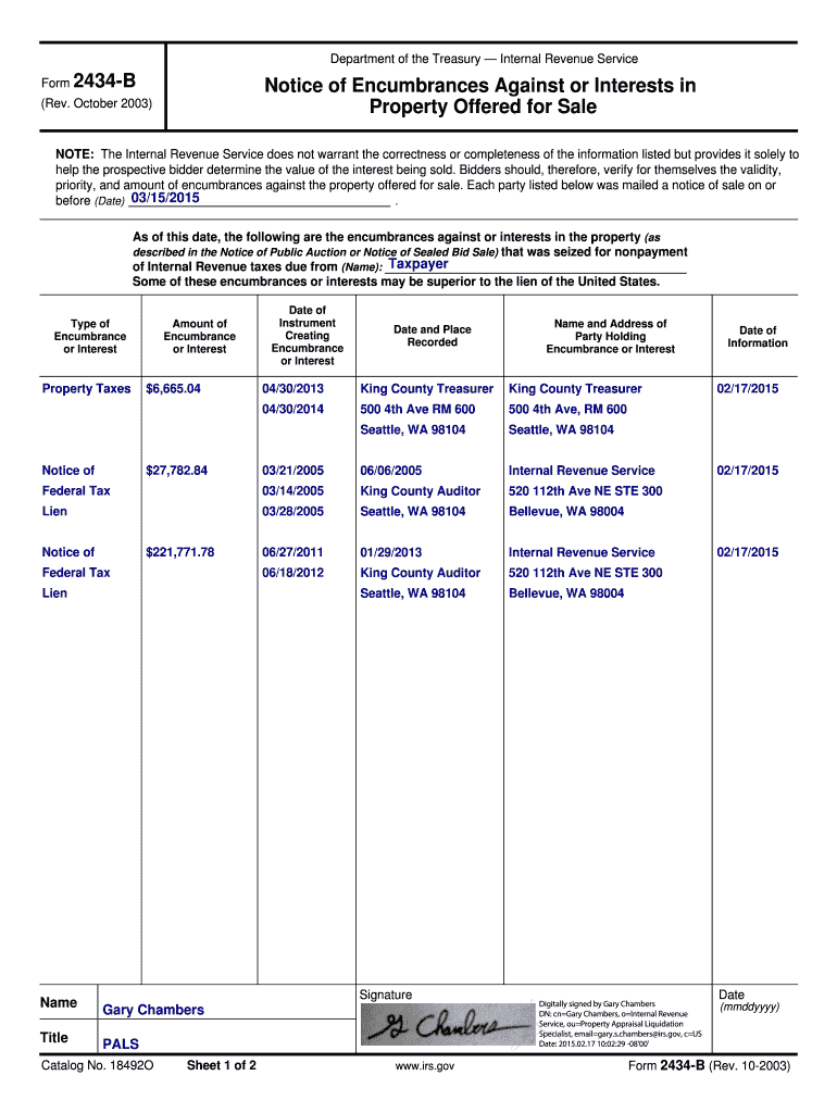 Signature. Date. Name. (mmddyyyy). Title. Form 2434-B (Rev. 10-2003) ... 03/15/ 2015 ... Revenue Code states that a certificate of sale of personal property.