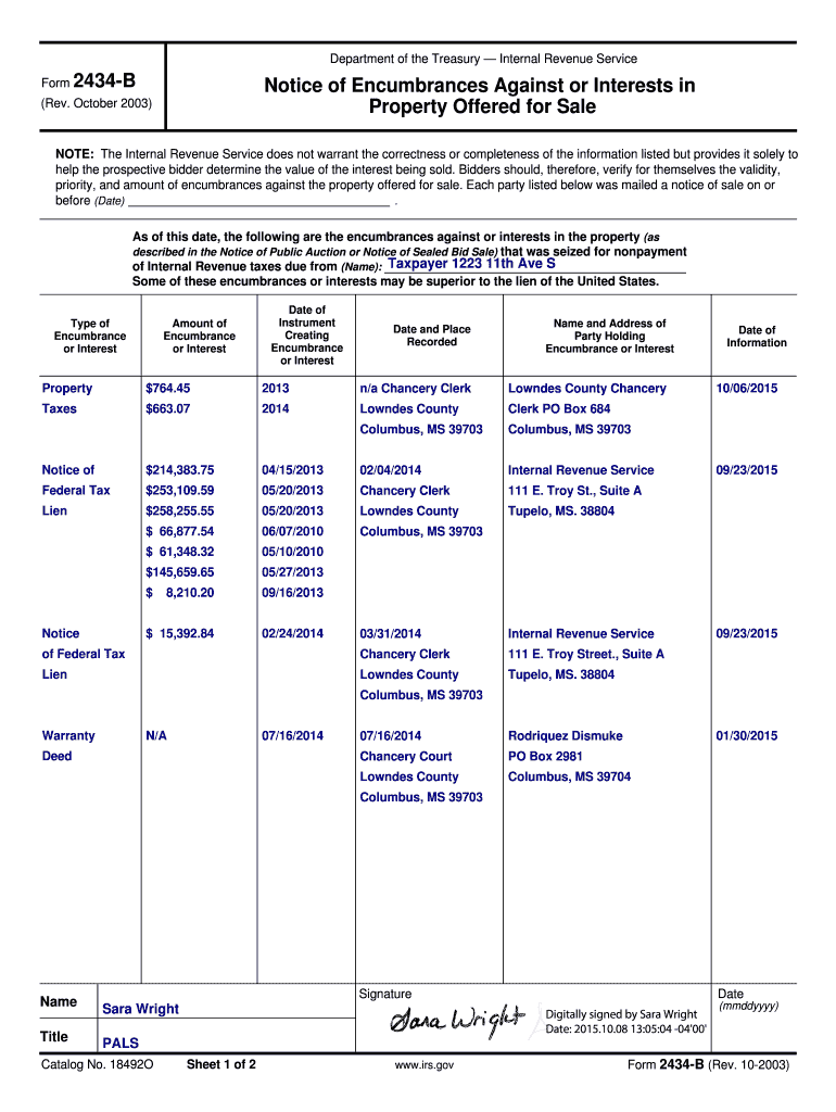 Signature. Date. Name. (mmddyyyy). Title. Form 2434-B (Rev. 10-2003) ... 10/06/ 2015 ... Revenue Code states that a certificate of sale of personal property.