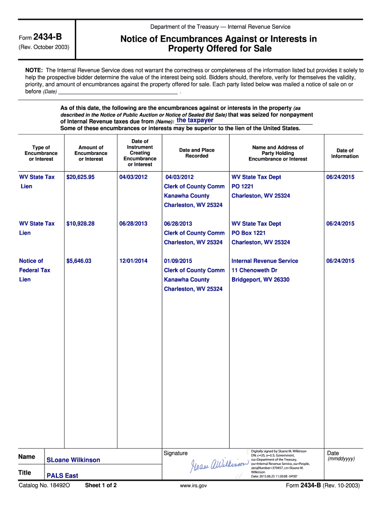 (Rev. October 2003). Name and Address of ... 06/24/2015. Lien. Clerk of ... Revenue Code states that a certificate of sale of personal property given or a deed to ...