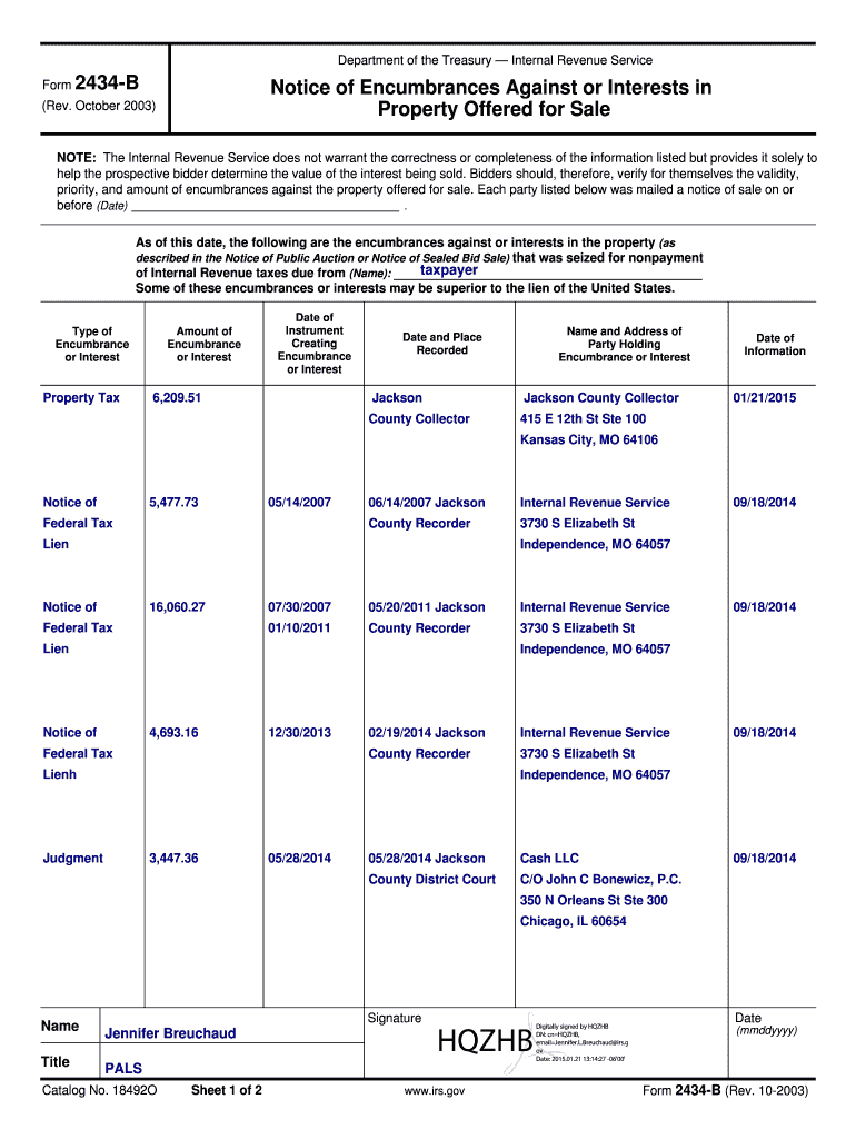 Form 2434-B (Rev. 10-2003). Catalog No. ... 4,693.16. 12/30/2013. 02/19/2014 Jackson ... Form of Remittance Payment must be made by cash, certified check ...