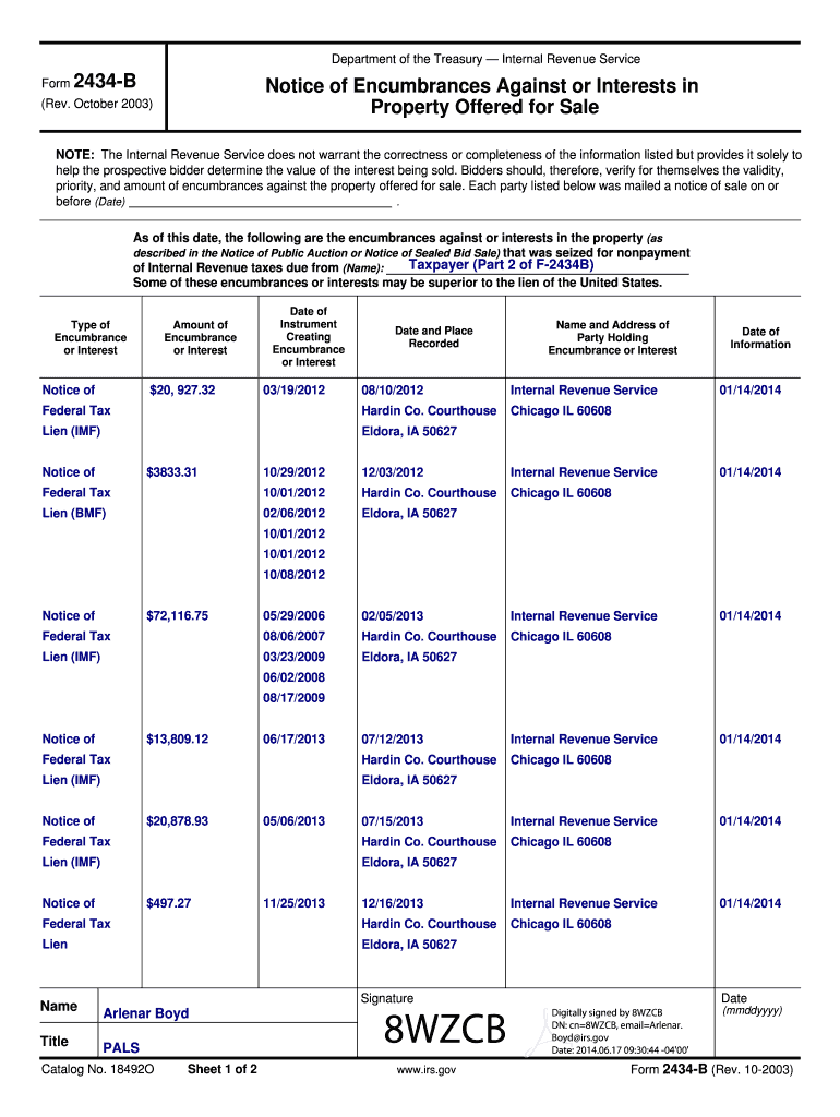 01/14/2014. Federal Tax ... Revenue Code states that a certificate of sale of personal property ... period, the Area Director shall, upon receipt of the certificate of.