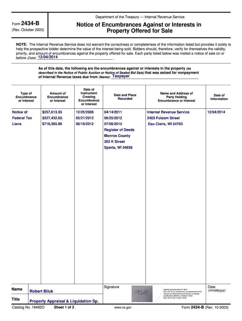 Signature. Date. Name. (mmddyyyy). Title. Form 2434-B (Rev. 10-2003) ... 12/04/ 2014 ... Revenue Code states that a certificate of sale of personal property.