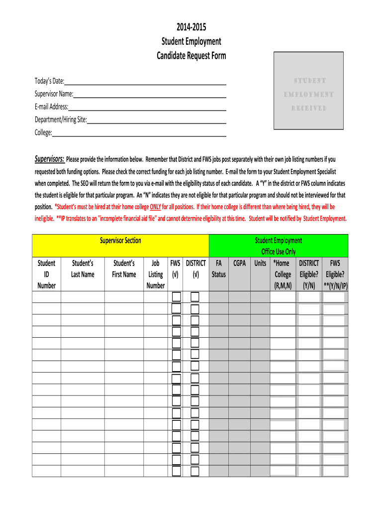 2014-2015. Student Employment. Candidate Request Form. Today#39’s Date: Supervisor Name: E-mail Address: Department/Hiring Site: College: Supervisors: ...