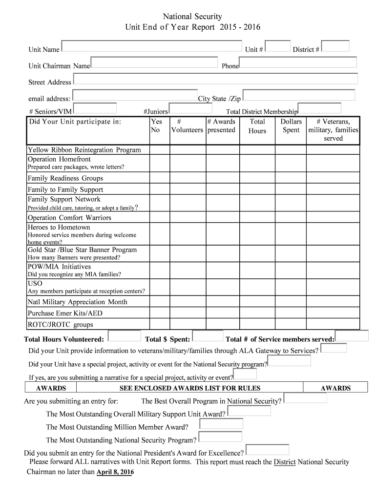 Please forward ALL narratives with Unit Report forms. This report must reach the District National Security. Chairman no later than April 8, 2016 ...
