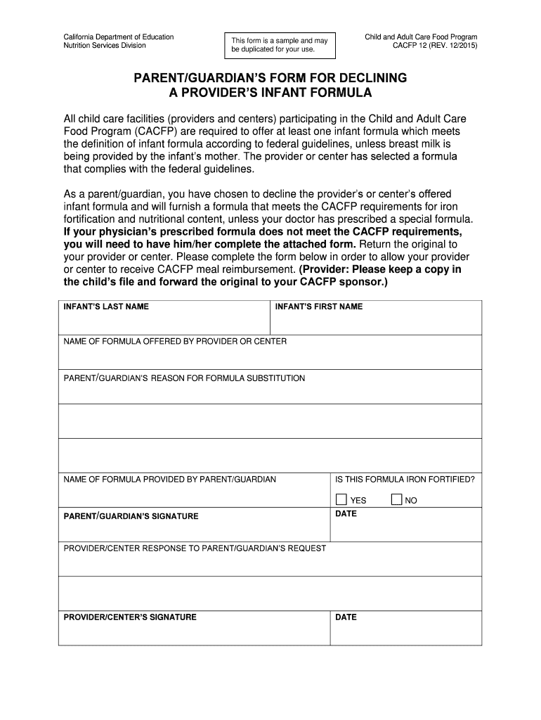 California Department of Education Nutrition Services Division Child and Adult Care Food Program CA CFP 12 (REV. 12/2015) This form is a sample and may be duplicated for your use. PARENT/GUARDIANS