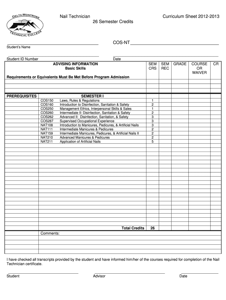 Nail Technician Curriculum Sheet 20122013 26 Semester Credits COST Students Name Student ID Number ADVISING INFORMATION Basic Skills Date SEM GRADE COURSE CR CRS REC OR WAIVER Requirements or Equivalents