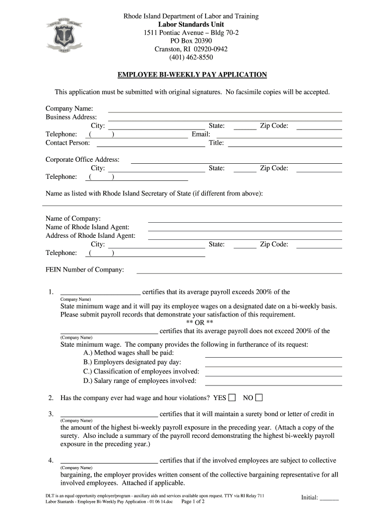 Any company operating in Rhode Island that wishes to pay its employees on a bi-weekly basis is eligible to use the Rhode Island Employee Bi-Weekly Pay Application.