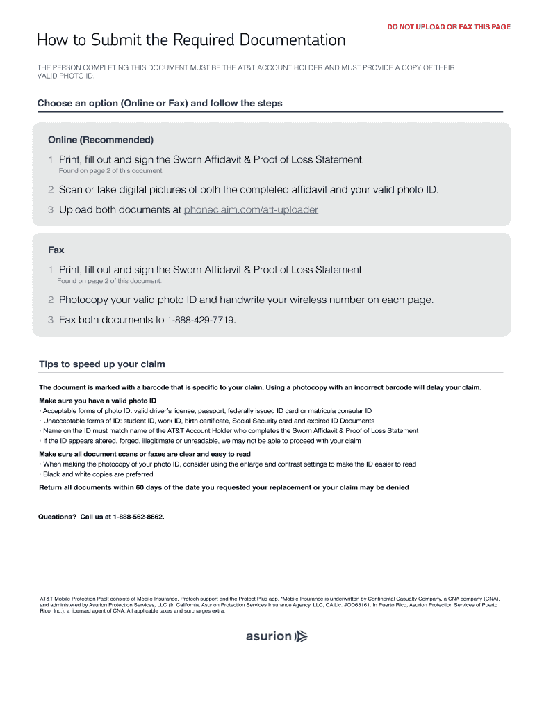 How to Submit the Required Documentation DO NOT UPLOAD OR FAX THIS PAGE THE PERSON COMPLETING THIS DOCUMENT MUST BE THE AT&T ACCOUNT HOLDER AND MUST PROVIDE A COPY OF THEIR VALID PHOTO ID. Choose