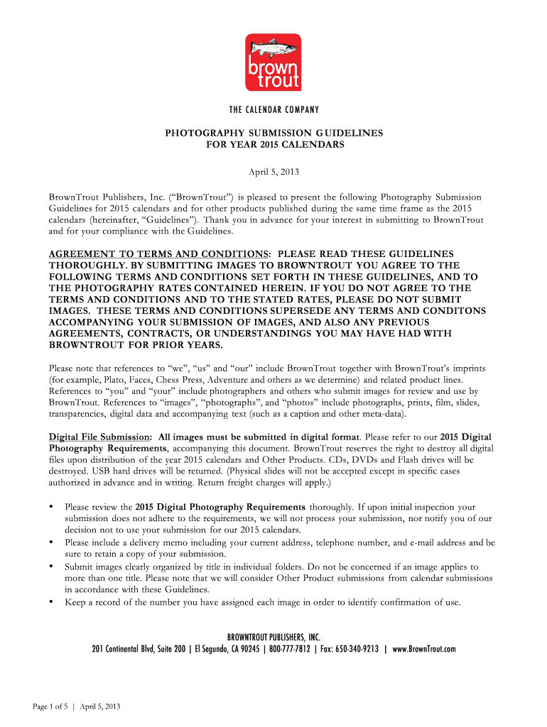 THE CALENDAR COMPANY PHOTOGRAPHY SUBMISSION G GUIDELINES FOR YEAR 2015 CALENDARS April 5, 2013, Brownout Publishers, Inc. (Brownout) is pleased to present the following Photography Submission Guidelines