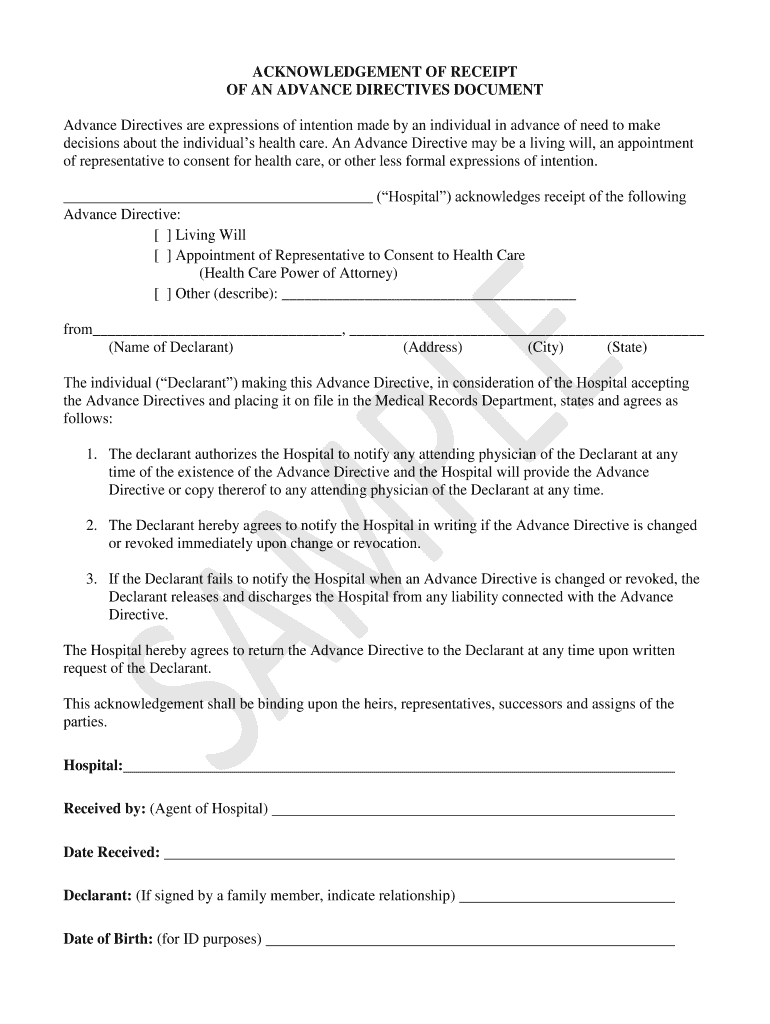 ACKNOWLEDGEMENT OF RECEIPT OF AN ADVANCE DIRECTIVES DOCUMENT Advance Directives are expressions of intention made by an individual in advance of need to make decisions about the individuals' health