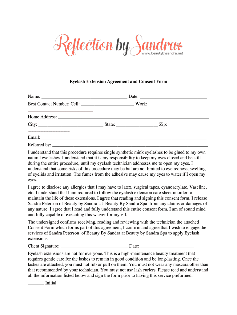 Eyelash Extension Agreement and Consent Form Name: Date: Best Contact Number: Cell: Work: Home Address: City: State: Zip: Email: Referred by: I understand that this procedure requires single synthetic