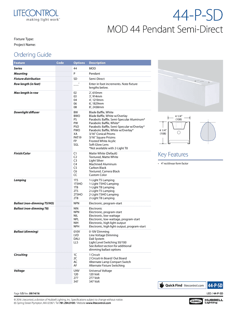 44-PSD MOD 4 Pendant Semi-Direct Quick Find litecontrol.com 44-P-SD Photometry Fixture: 44-P-SD-04-SGL-CX-1T8 Camping: 1-T8 Efficiency: 39% Distribution: 4/96