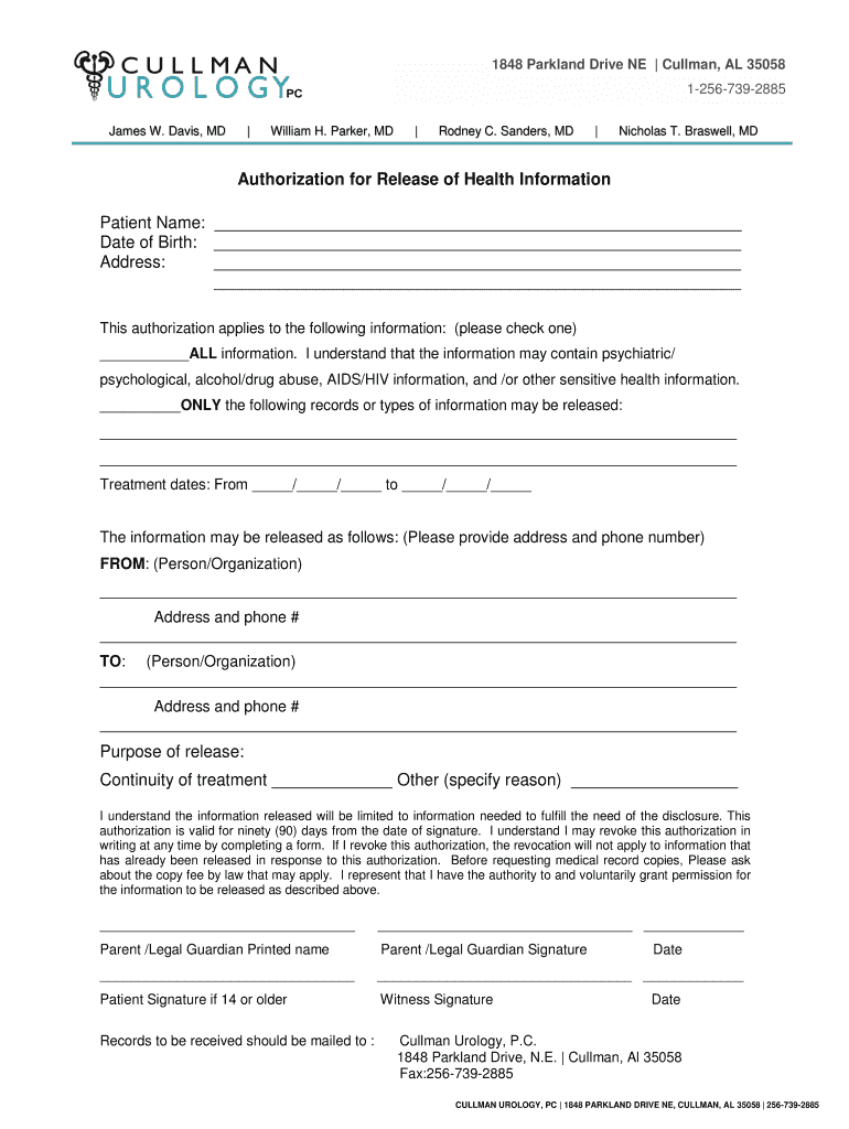 1848 Parkland Drive NE Cullman, AL 35058 12567392885 James W. Davis, MD William H. Parker, MD Rodney C. Sanders, MD Nicholas T. Bra swell, MD Authorization for Release of Health Information Patient