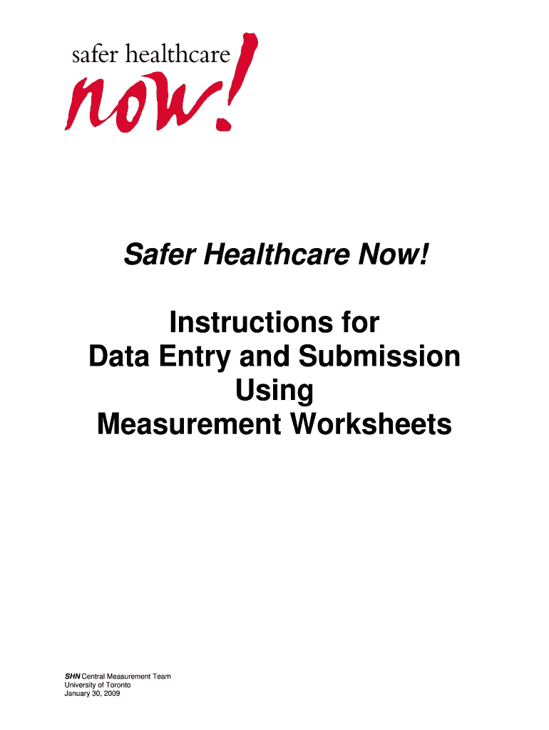 Safer Healthcare Now! Instructions for Data Entry and Submission Using Measurement Worksheets SHN Central Measurement Team University of Toronto January 30, 2009, Safer Healthcare Now! Data Entry