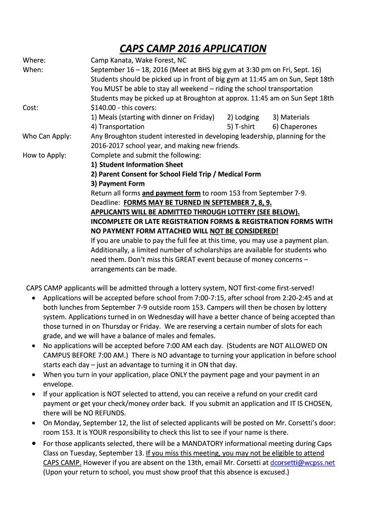 CAPS CAMP 2016 APPLICATION Where: When: Cost: Who Can Apply: How to Apply: Camp Kana ta, Wake Forest, NC September 16 18, 2016 (Meet at BHS big gym at 3:30 pm on Fri, Sept. 16) Students should be