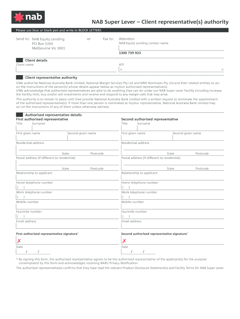NAB Super Lever Client representative(s) authority Please use blue or black pen and write in BLOCK LETTERS Send to: NAB Equity Lending PO Box 5350 Melbourne Vic 3001 or Fax to: Attention NAB Equity