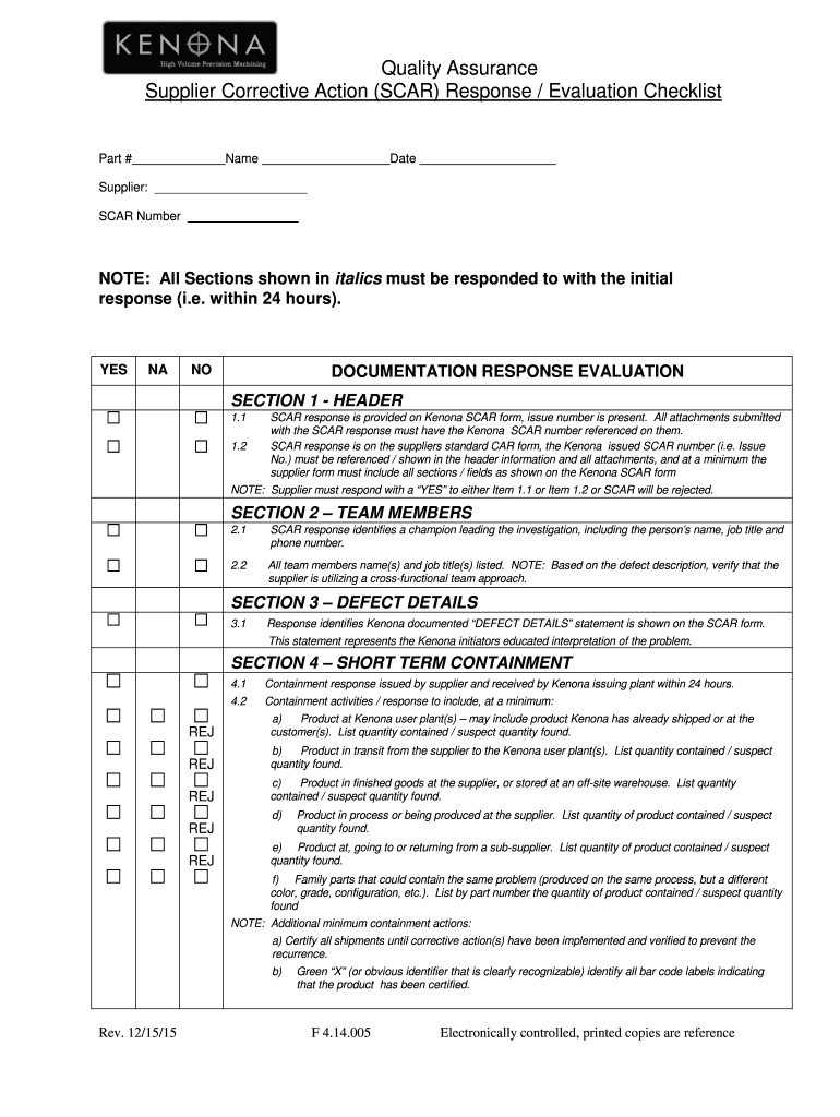 Quality Assurance Supplier Corrective Action (SCAR) Response / Evaluation Checklist Part # Name Date Supplier: SCAR Number NOTE: All Sections shown in italics must be responded to with the initial