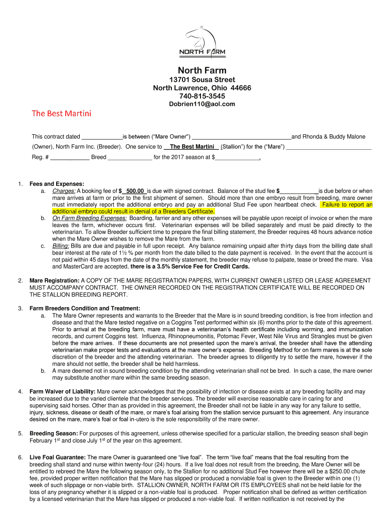 North Farm 13701 Sousa Street North Lawrence, Ohio 44666 7408153545 Dobrien110 aol.com The Best Martini This contract dated is between (Mare Owner “) (Owner), North Farm Inc. (Breeder). One service