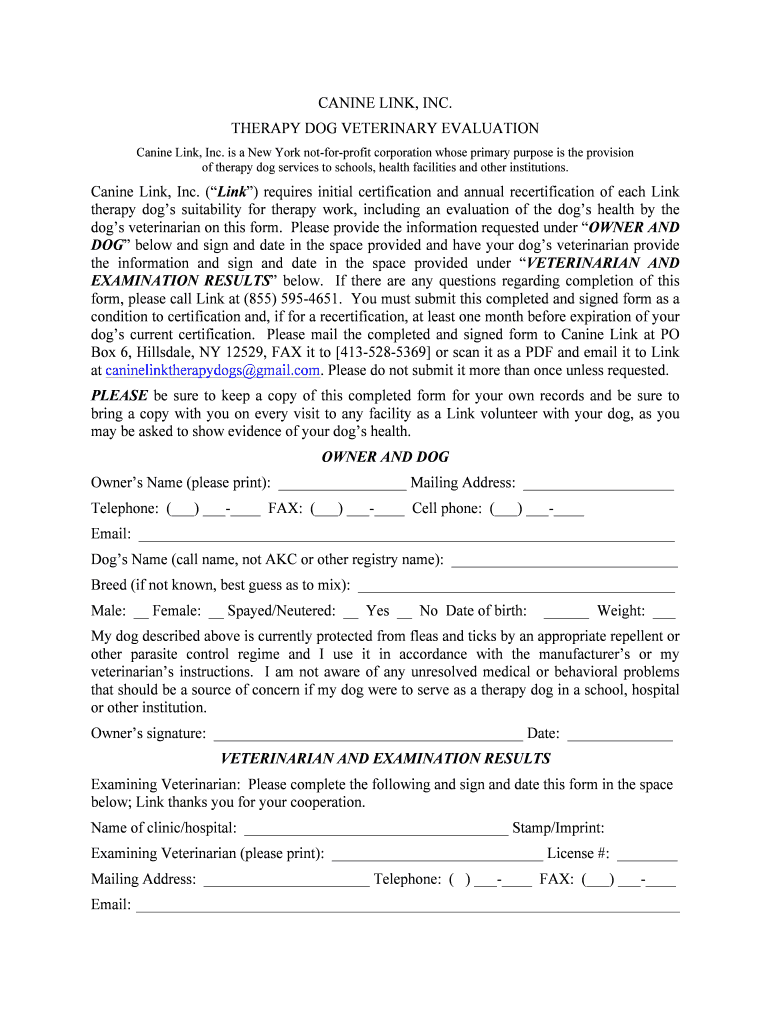 CANINE LINK, INC. THERAPY DOG VETERINARY EVALUATION Canine Link, Inc. is a New York notforprofit corporation whose primary purpose is the provision of therapy dog services to schools, health facilities