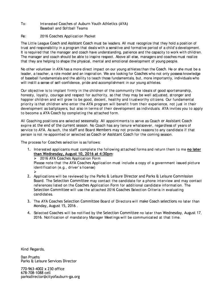 To: Interested Coaches of Auburn Youth Athletics (AYA) Baseball and Softball Teams Re: 2016 Coaches Application Packet The Little League Coach and Assistant Coach must be leaders. All must recognize