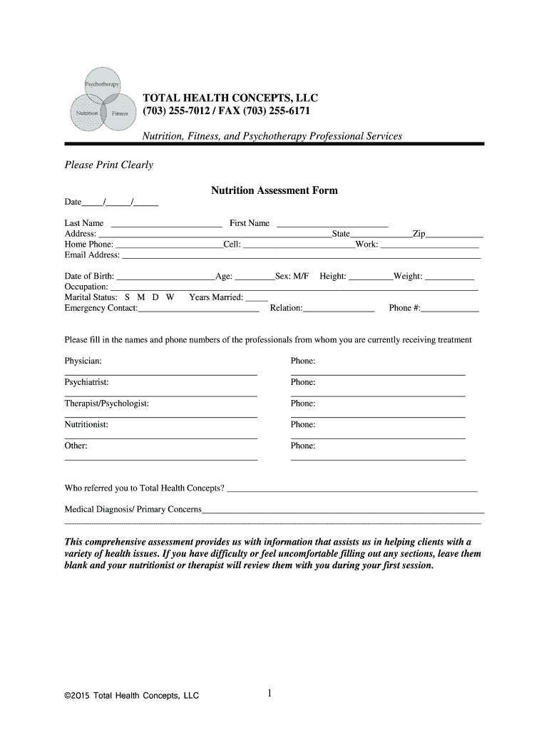 TOTAL HEALTH CONCEPTS, LLC (703) 2557012 / FAX (703) 2556171 Nutrition, Fitness, and Psychotherapy Professional Services Please Print Clearly Nutrition Assessment Form Date / / Last Name First Name