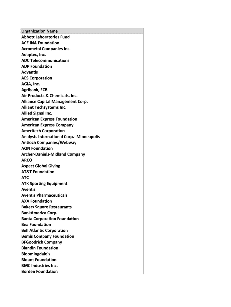 Organization Name Abbott Laboratories Fund ACE INA Foundation Acromial Companies Inc. Adapted, Inc. ADC Telecommunications ADP Foundation Adv antis AES Corporation ASIA, Inc. African, FCB Air Products