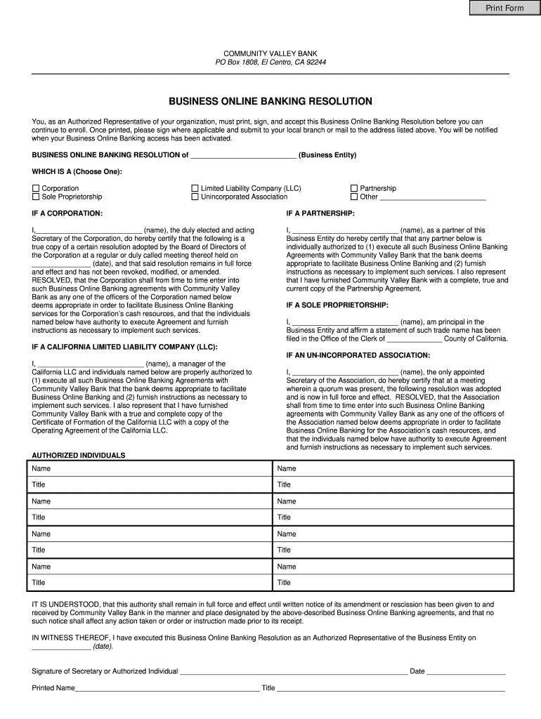 Print Form COMMUNITY VALLEY BANK PO Box 1808, El CENTR, CA 92244 BUSINESS ONLINE BANKING RESOLUTION You, as an Authorized Representative of your organization, must print, sign, and accept this Business
