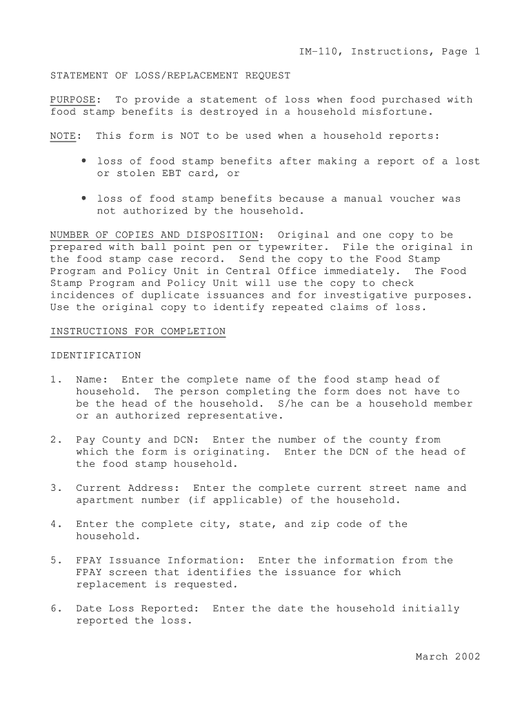 IM110, Instructions, Page 1 STATEMENT OF LOSS/REPLACEMENT REQUEST PURPOSE: To provide a statement of loss when food purchased with food stamp benefits is destroyed in a household misfortune. NOTE: