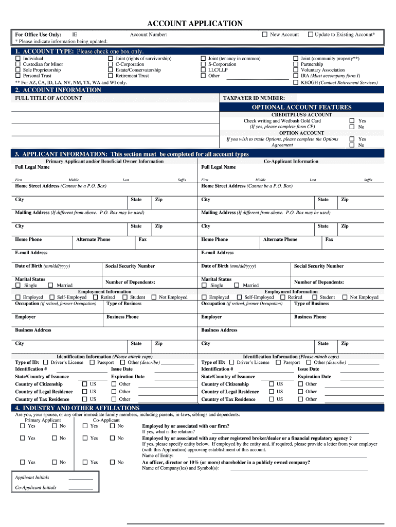 CLEAR FORM ACCOUNT APPLICATION IE For Office Use Only: * Please indicate information being updated: Account Number: New Account Update to Existing Account* 1. ACCOUNT TYPE: Please check one box only.