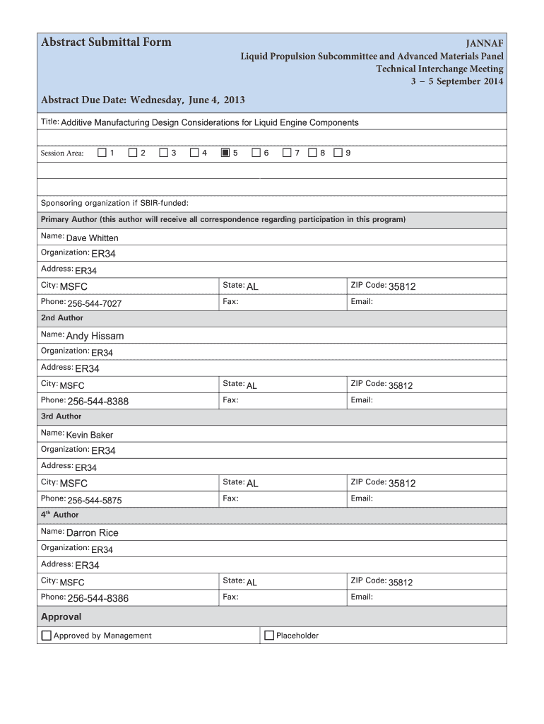 Abstract Submittal Form JANNA Liquid Propulsion Subcommittee and Advanced Materials Panel Technical Interchange Meeting 3 5 September 2014 Abstract Due Date: Wednesday, June 4, 2013 Title: Additive